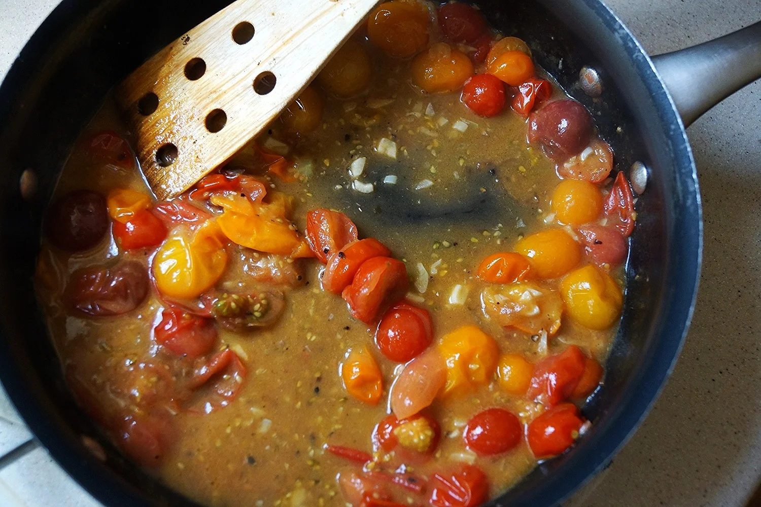 - 1 pint cherry tomatoes, halved (any cherry tomatoes will work, but Sungolds are particularly awesome here!)