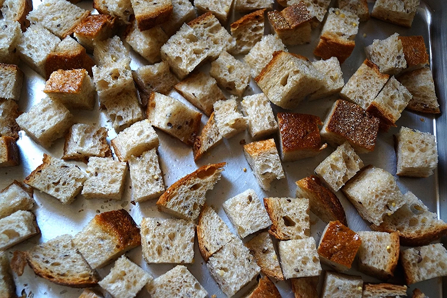 3. Toss the bread cubes with 2 Tbsp of olive oil, spread in a single layer on a baking sheet and bake at 400 degrees until bread is crispy and edges are golden brown, about 12-15 minutes.