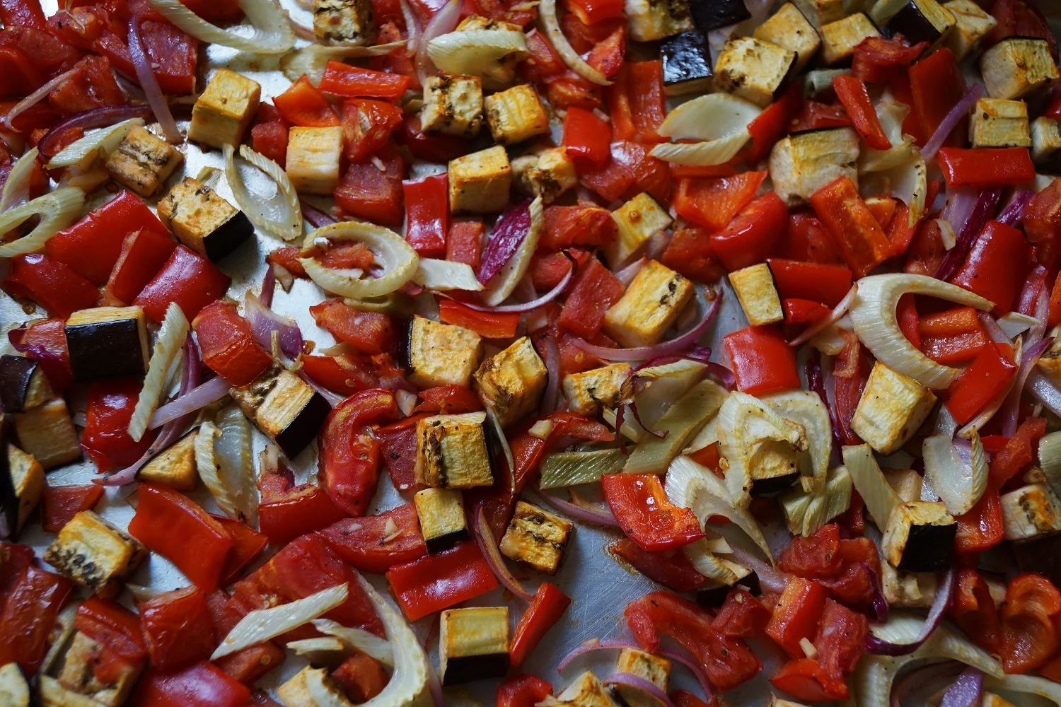 2. In a large bowl, mix together the eggplant, red pepper, fennel, tomatoes, onion, garlic, salt, pepper, 2 Tbsp olive oil, and balsamic vinegar. Stir to combine well. Spread vegetables in a single layer on a baking sheet, and bake at 400 degrees for about 35 minutes.