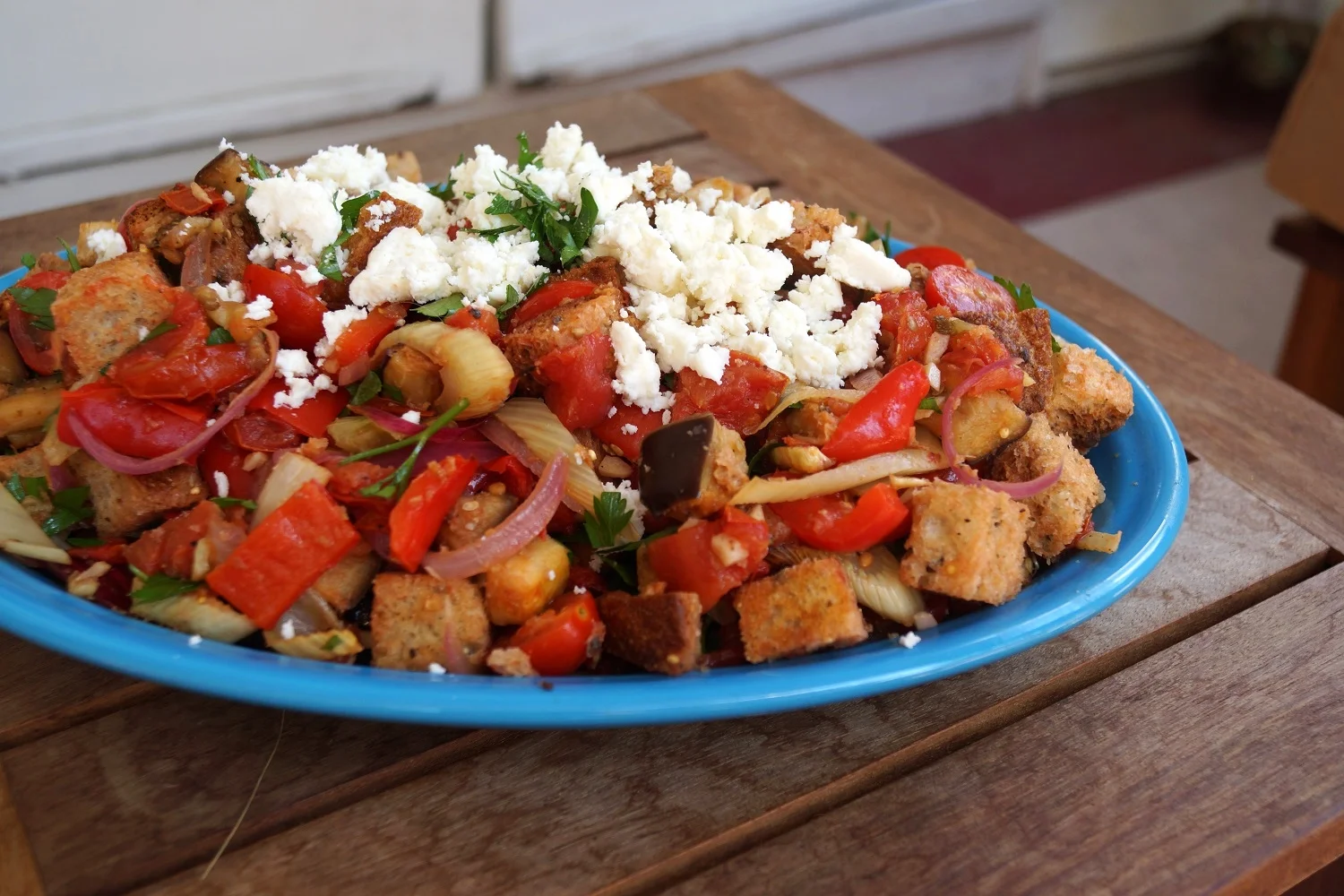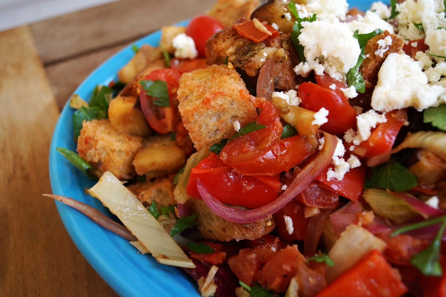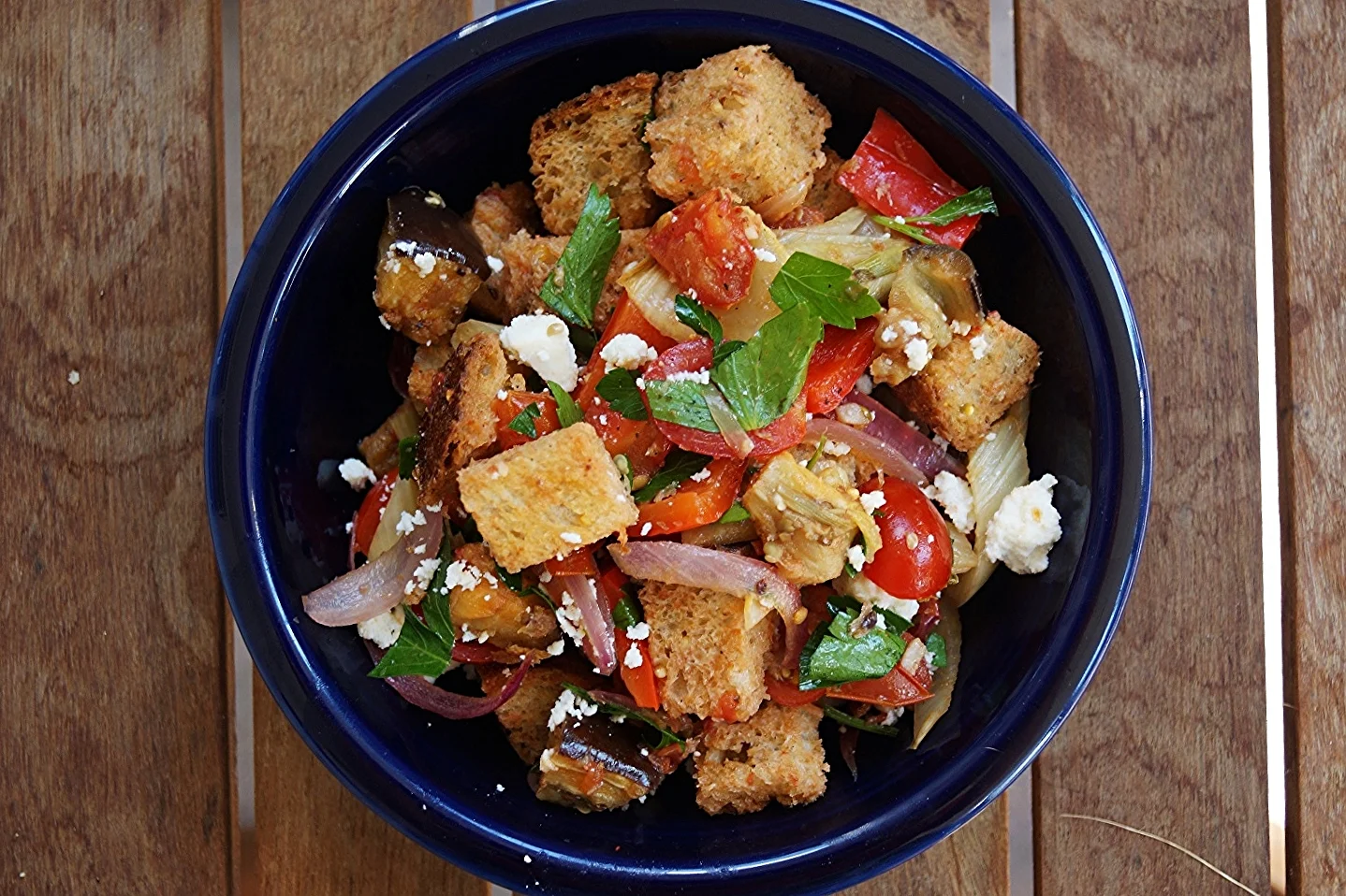 Of course, we’re not talking just any salad here. Oh, no. We’re talking about the panzanella, a.k.a the BEST kind of salad. Any salad where the lettuce has been replaced with crunchy homemade croutons is pretty darn awesome in my book. Adding some roasted eggplant is icing on the cake. And while we’re roasting that eggplant, we may as well roast some other summer veggies, for added variety and deliciousness. Throw in some cherry tomatoes, fresh parsley, and top it with some crumbled cheese, and boom. Now that’s a salad.