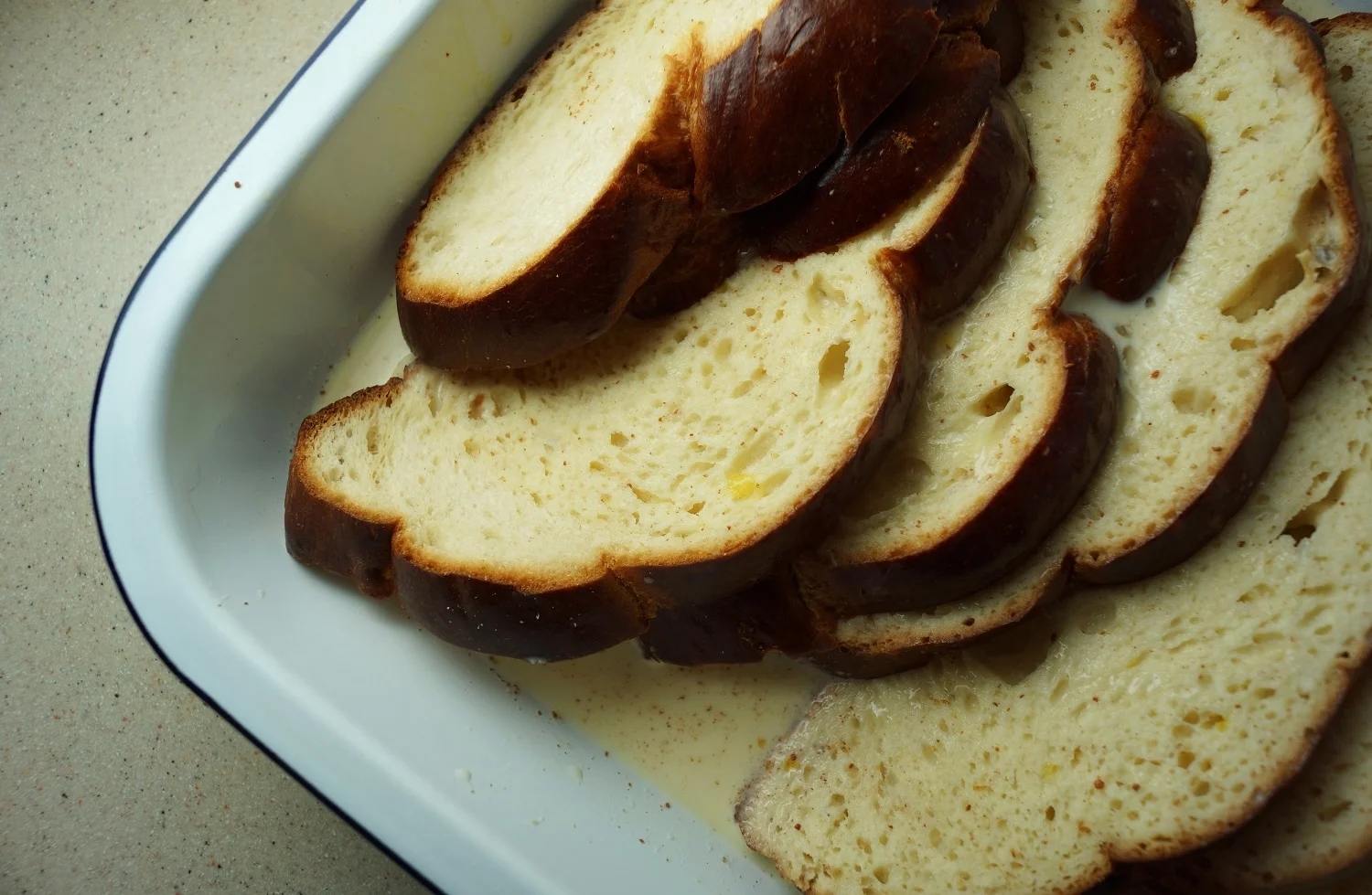 - 1 pound loaf challah bread, preferably stale, sliced into 1” thick slices