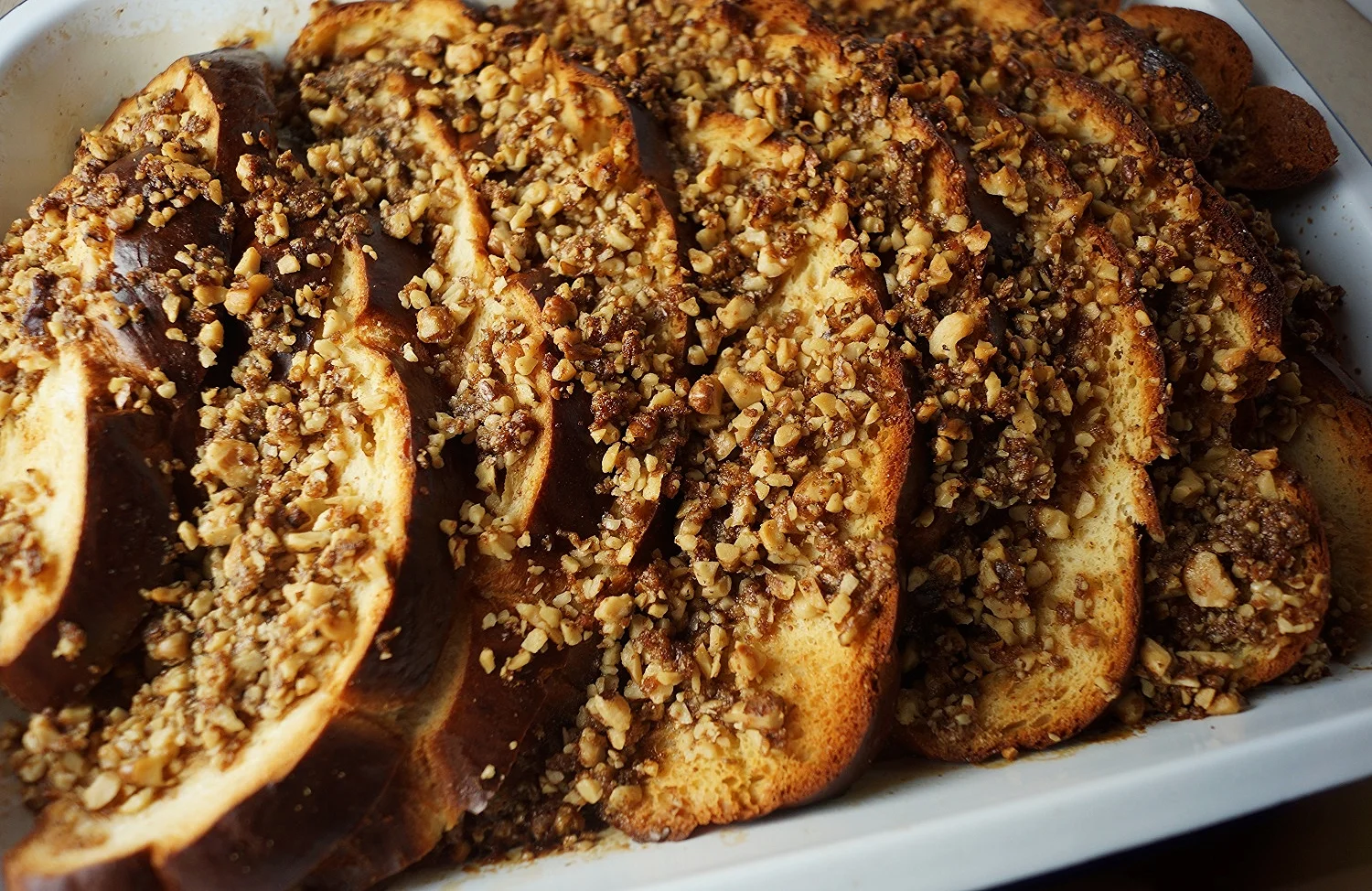 7. Sprinkle walnut crumble mixture evenly atop the soaked bread, re-cover tightly with the foil, and place in the oven. Bake covered for 20 minutes, then remove foil and continue to bake until top is golden brown and walnuts are toasty - about 25 minutes more.