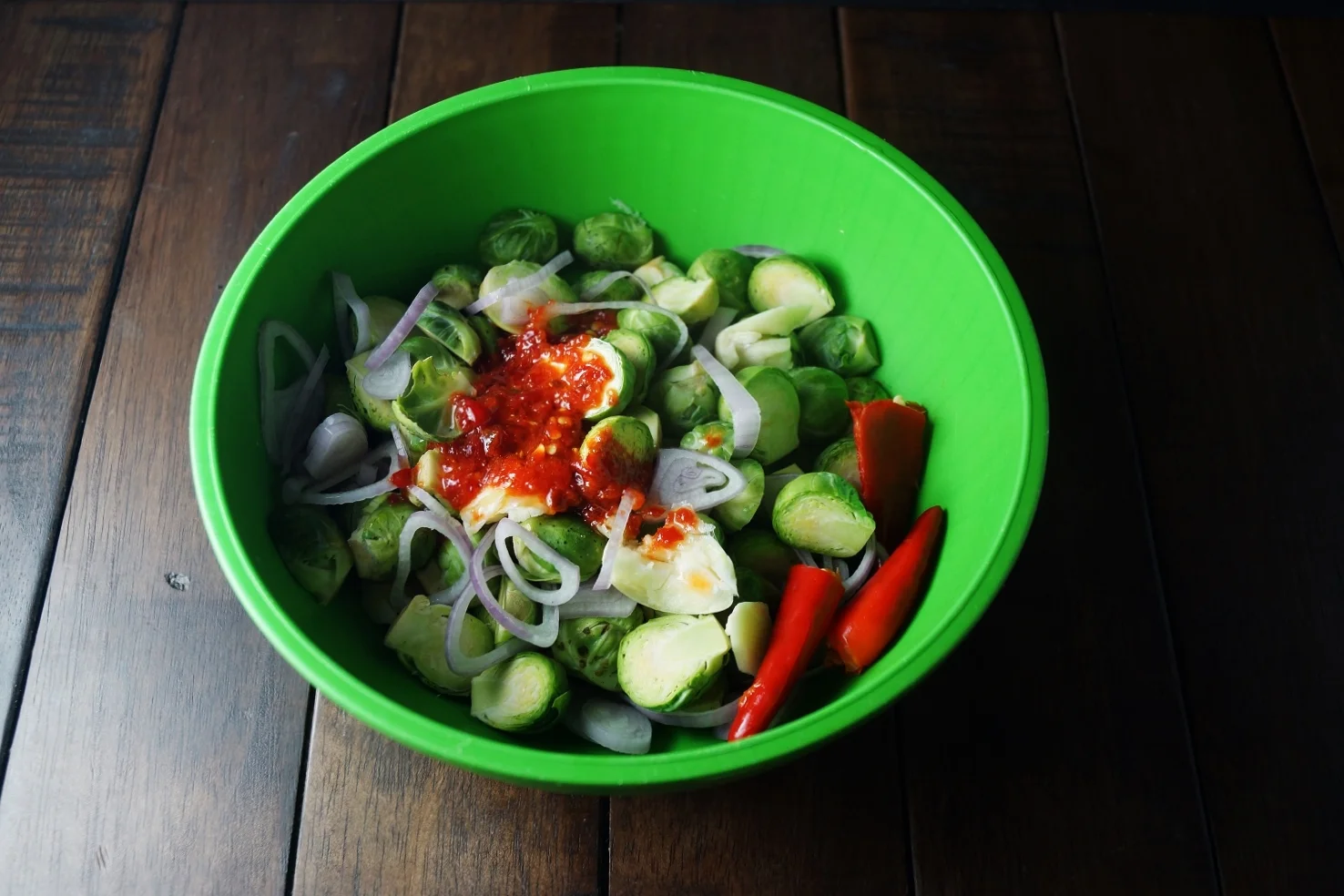 2. Place halved brussels sprouts in a medium bowl, along with the sliced shallot, smashed garlic, and chiles (if using). In a small bowl or measuring cup, whisk together the oil and sambal oelek. Pour over the brussels sprouts mixture, and mix until vegetables are evenly coated.