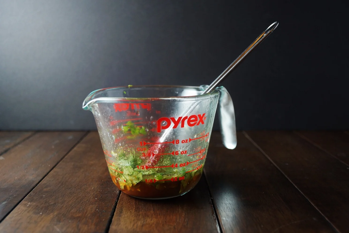 4. While brussels sprouts are roasting, make the vinaigrette by whisking together the cilantro, lime juice, canola oil, fish sauce, brown sugar, and sriracha until smooth.
