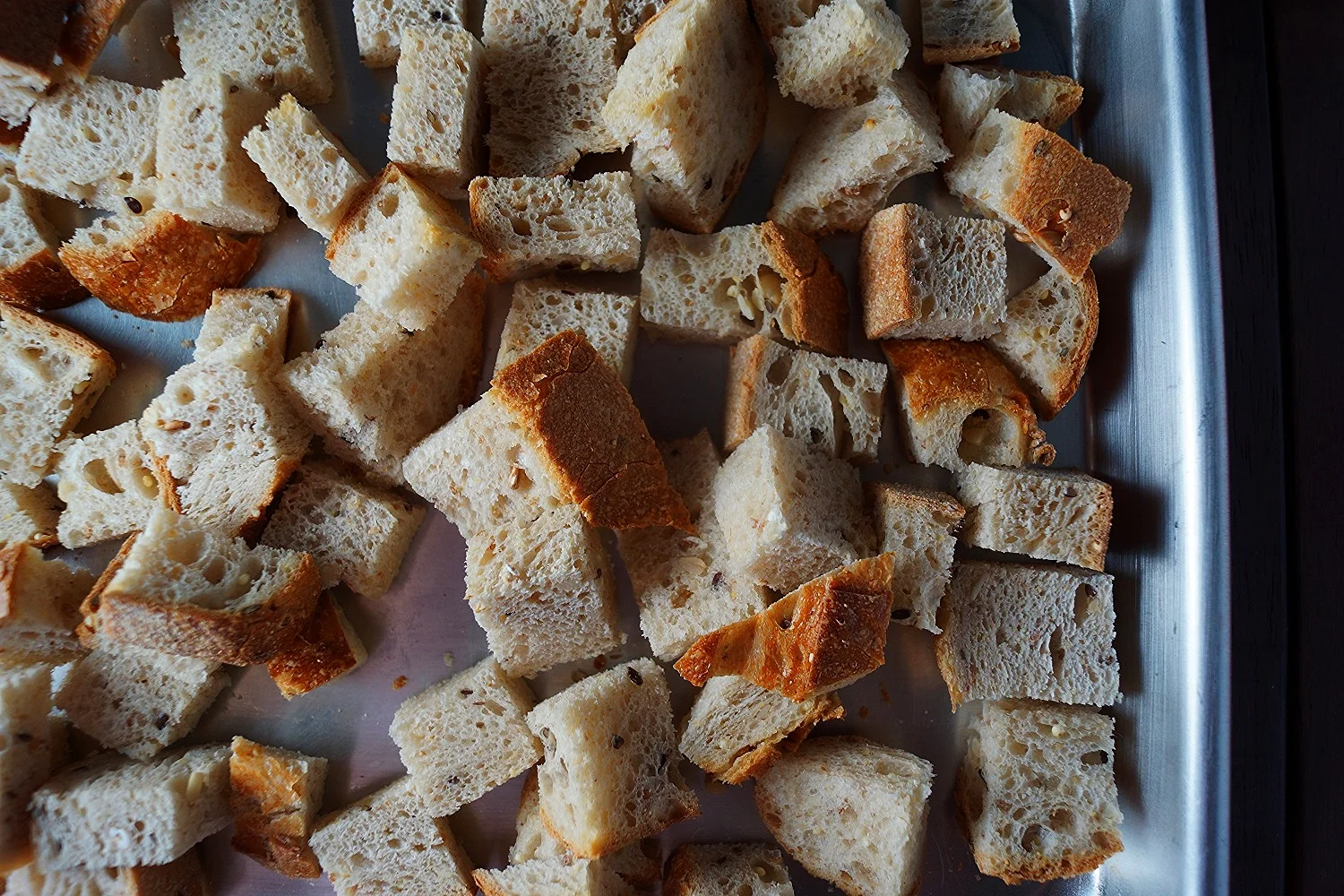 2. If your bread is not already stale, lay the bread cubes in a single layer on a baking sheet and bake at 350 for about 10 minutes, until they crisp up slightly. Or, if you plan ahead, you can leave the bread cubes lying out on your kitchen counter overnight to help speed up the staling process.