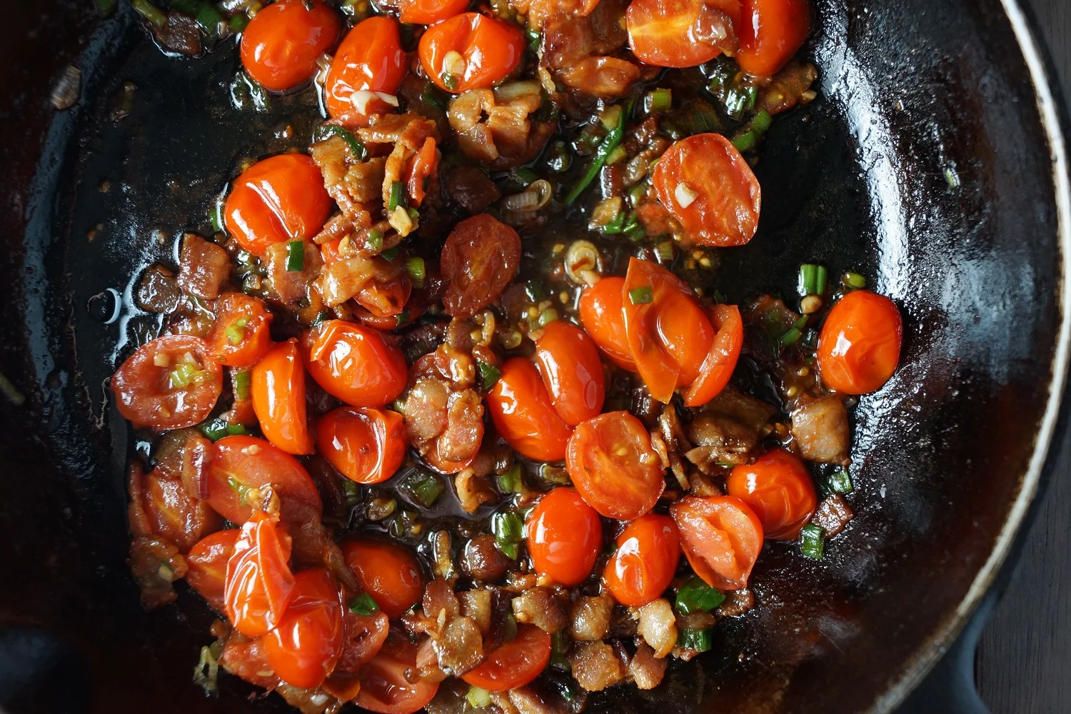 5. Add the garlic, scalllions, tomatoes, and red pepper flakes to the pan, and continue to cook until tomatoes soften and start to burst, about 5 minutes. Add the balsamic vinegar and cook 1 minute more.