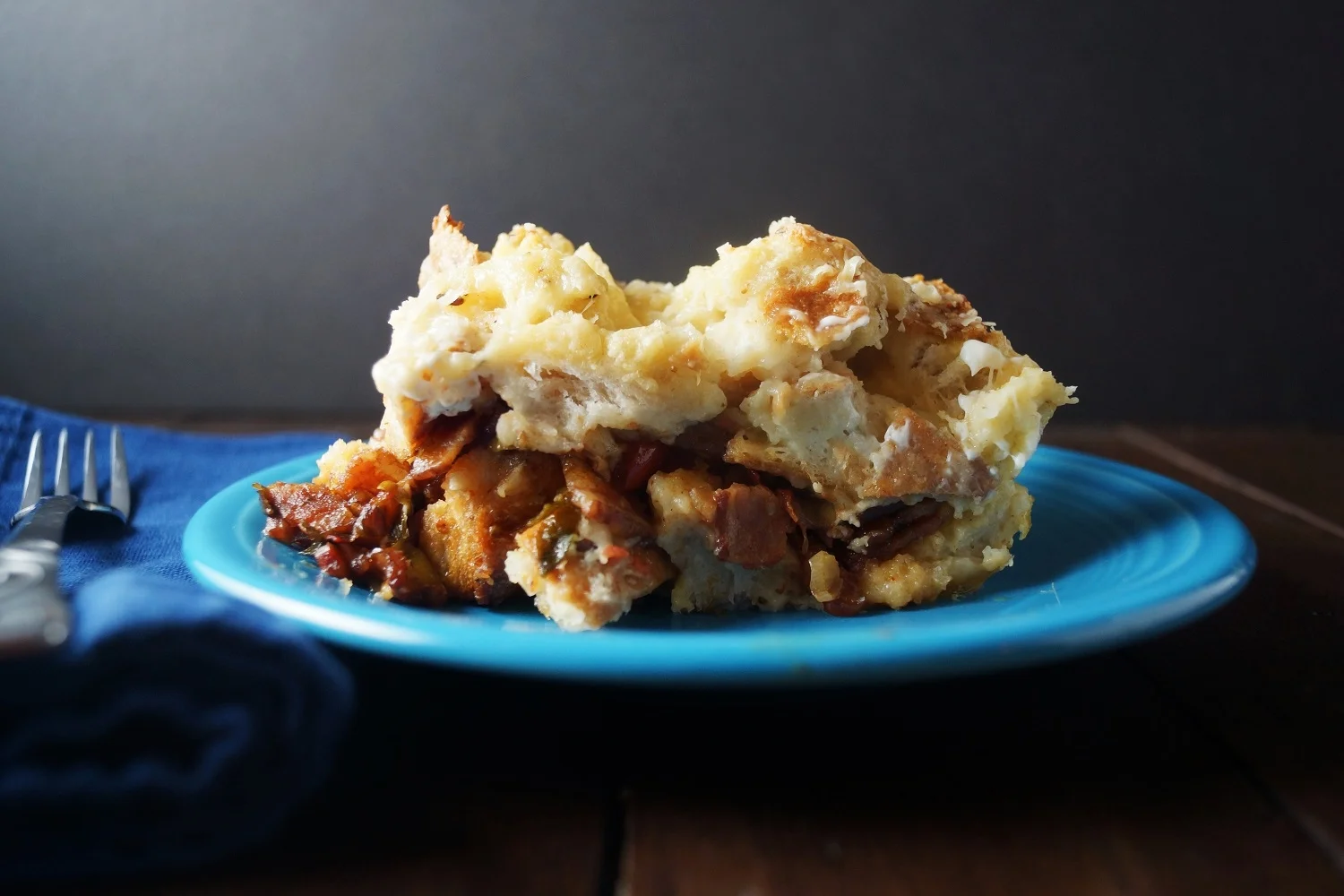 Now, while this dish is in fact a bread pudding, it technically resides in the small offshoot category of bread puddings known as stratas. Strata means layers, and when you see how this dish is constructed, you’ll immediately understand its name. Instead of mixing all of the ingredients together, the tomato and bacon mixture is layered between two layers of eggy, custardy bread before baking. It’s like a little tasty surprise just waiting for you to dig into. The result is one terrifically tasty dish that makes you think of summer, but at the same time is warm and cheesy and filling enough for colder weather. Best of both worlds? I think yes.