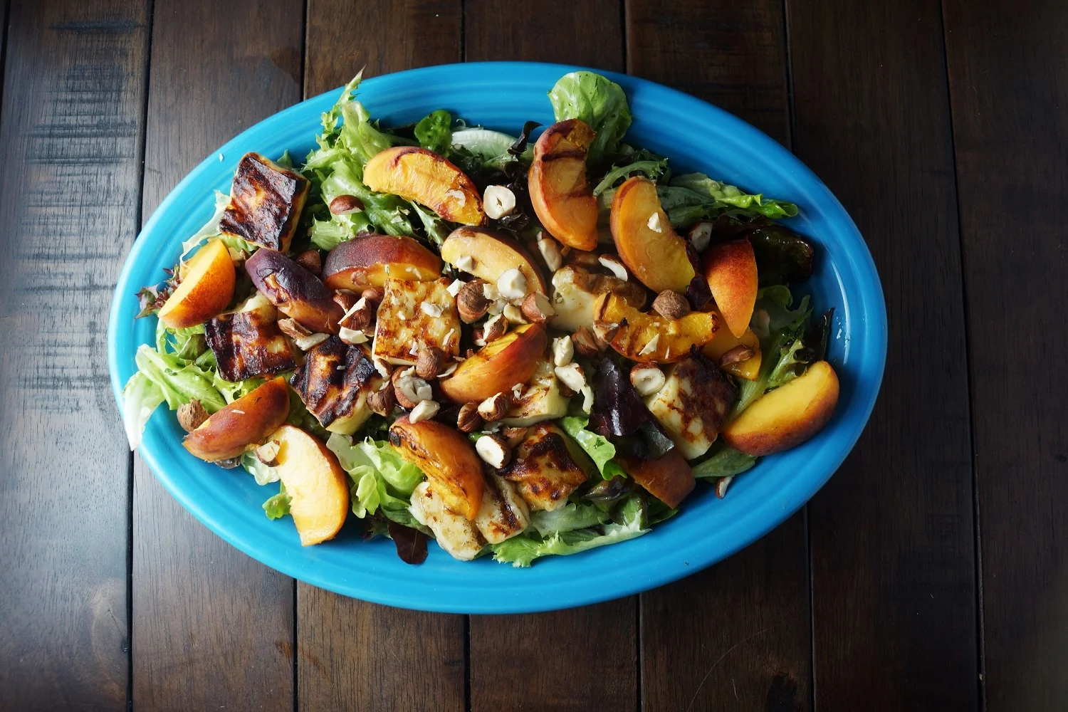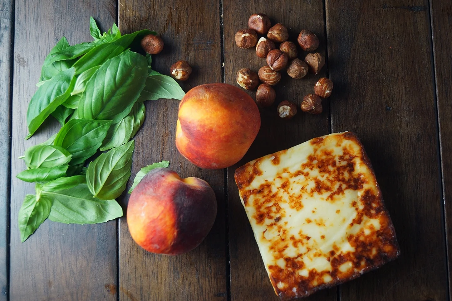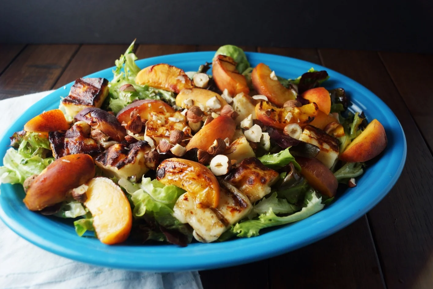 Grilled Peach and Bread Cheese Salad with Basil Vinaigrette