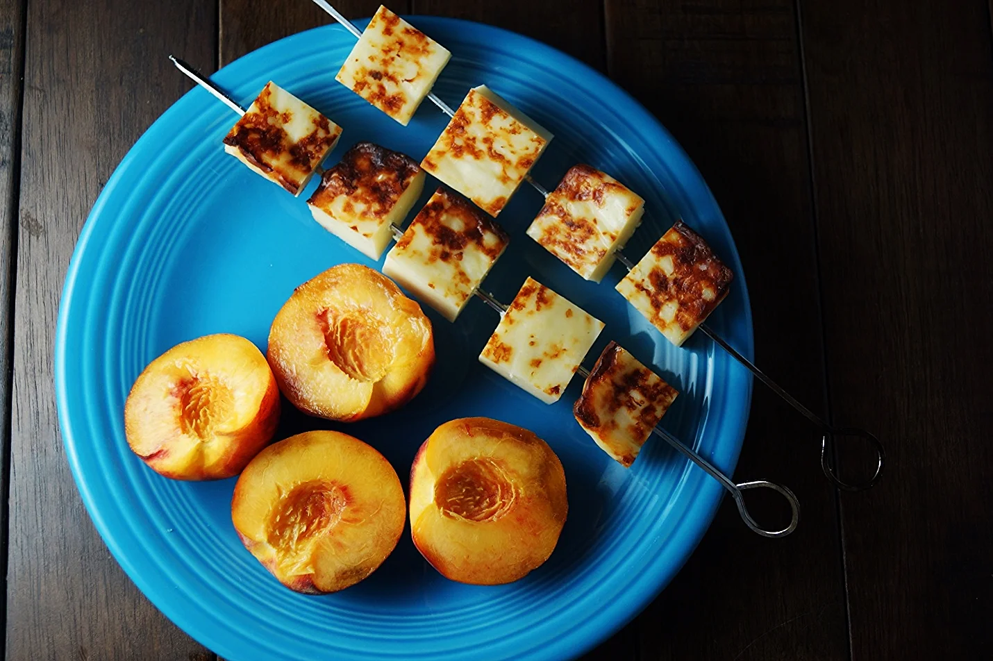 3. Skewer cheese pieces on wood or metal skewers for easier grilling ( if using wood skewers, soak them in water first to prevent them from burning). Place cheese skewers and peach halves (cut side down) on the grill and cook, flipping cheese occasionally, until cheese is melty and golden and peaches are beginning to caramelize, about 7-9 minutes.
