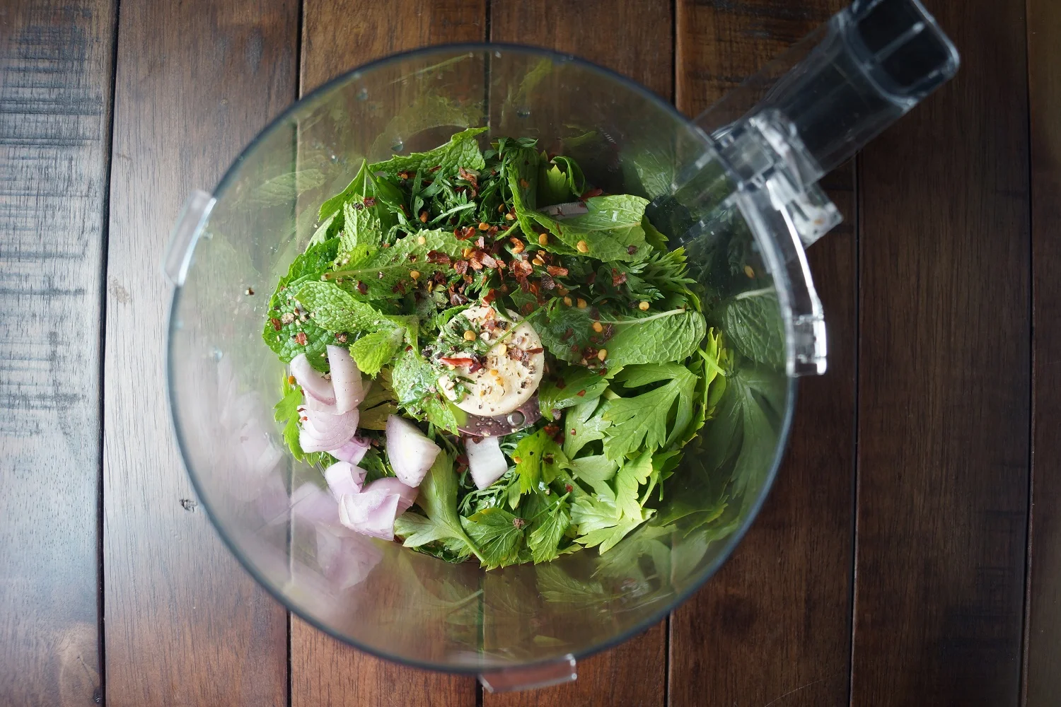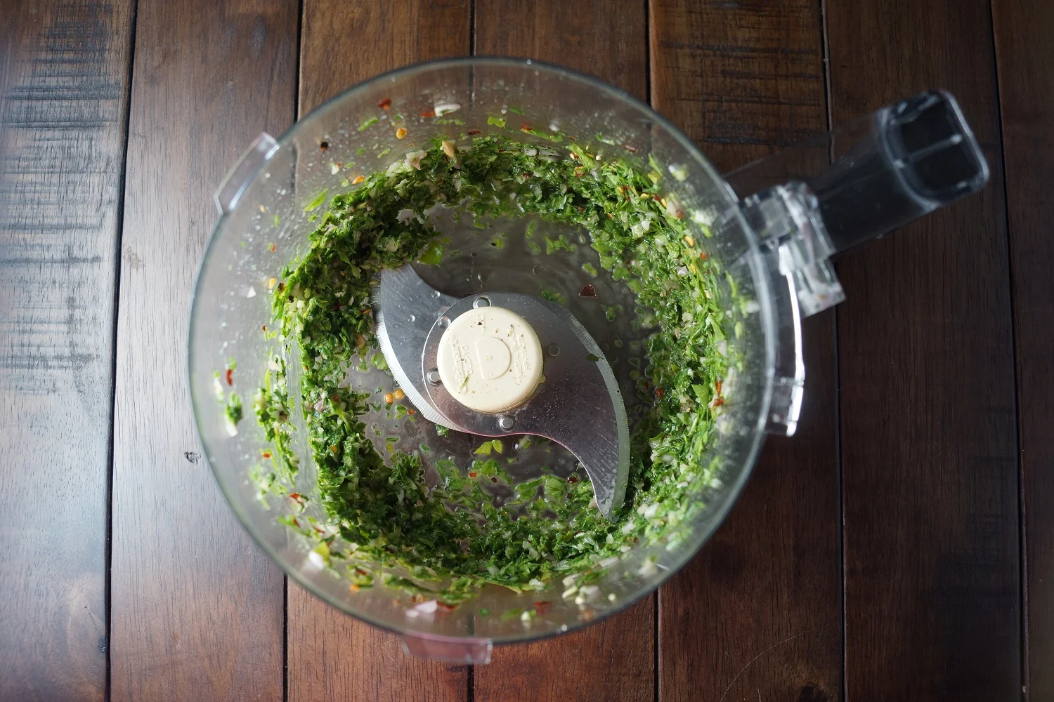 1. Combine the carrot greens, parsley, mint, olive oil, shallot, lemon juice, salt, pepper, and crushed red pepper in a food processor and pulse until mixture is finely chopped and well mixed, about 20-30 seconds.