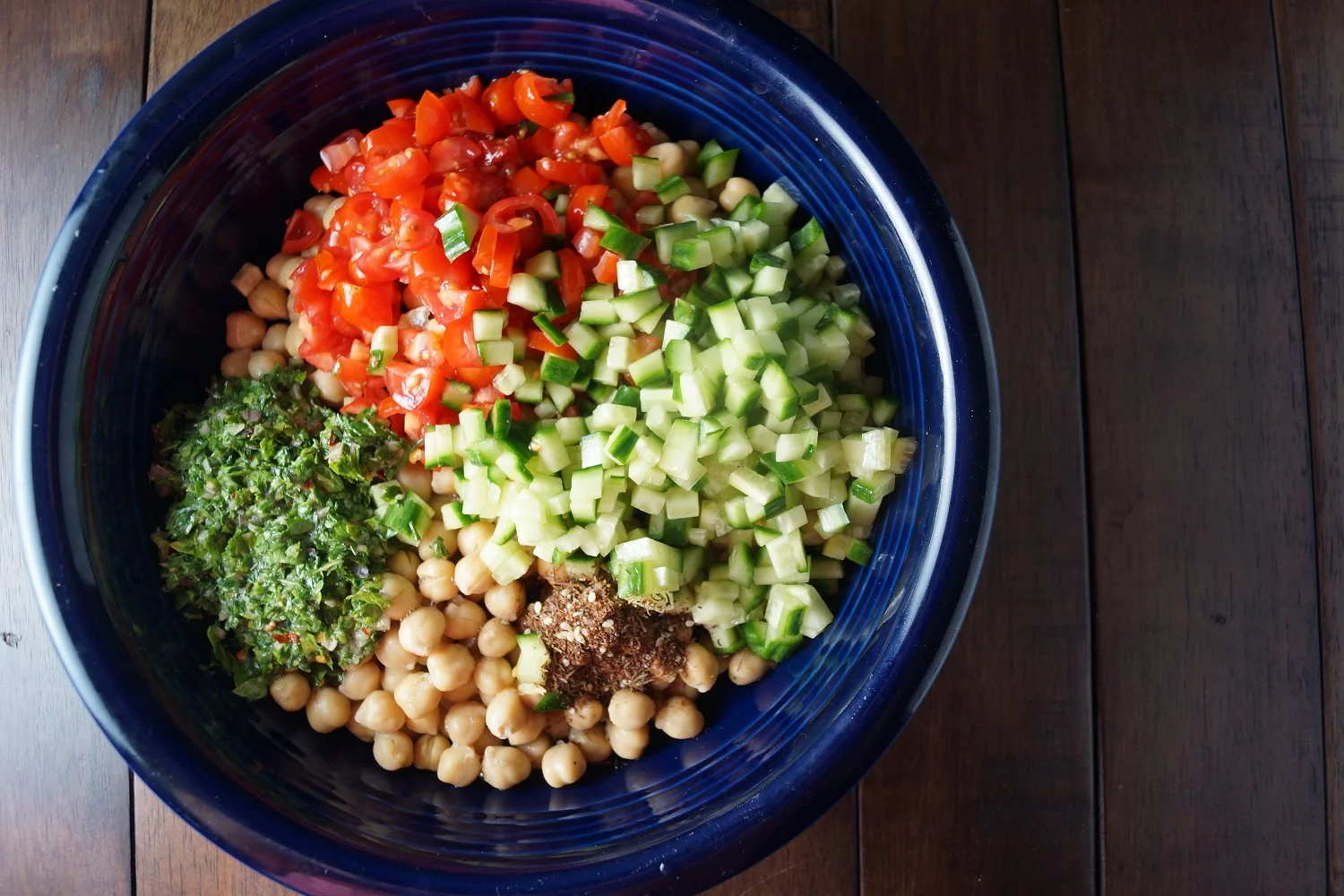 2. In a large bowl, mix together the herb mixture, chickpeas, chopped tomato, chopped cucumber, and za’atar if using. Season to taste with additional salt as needed.