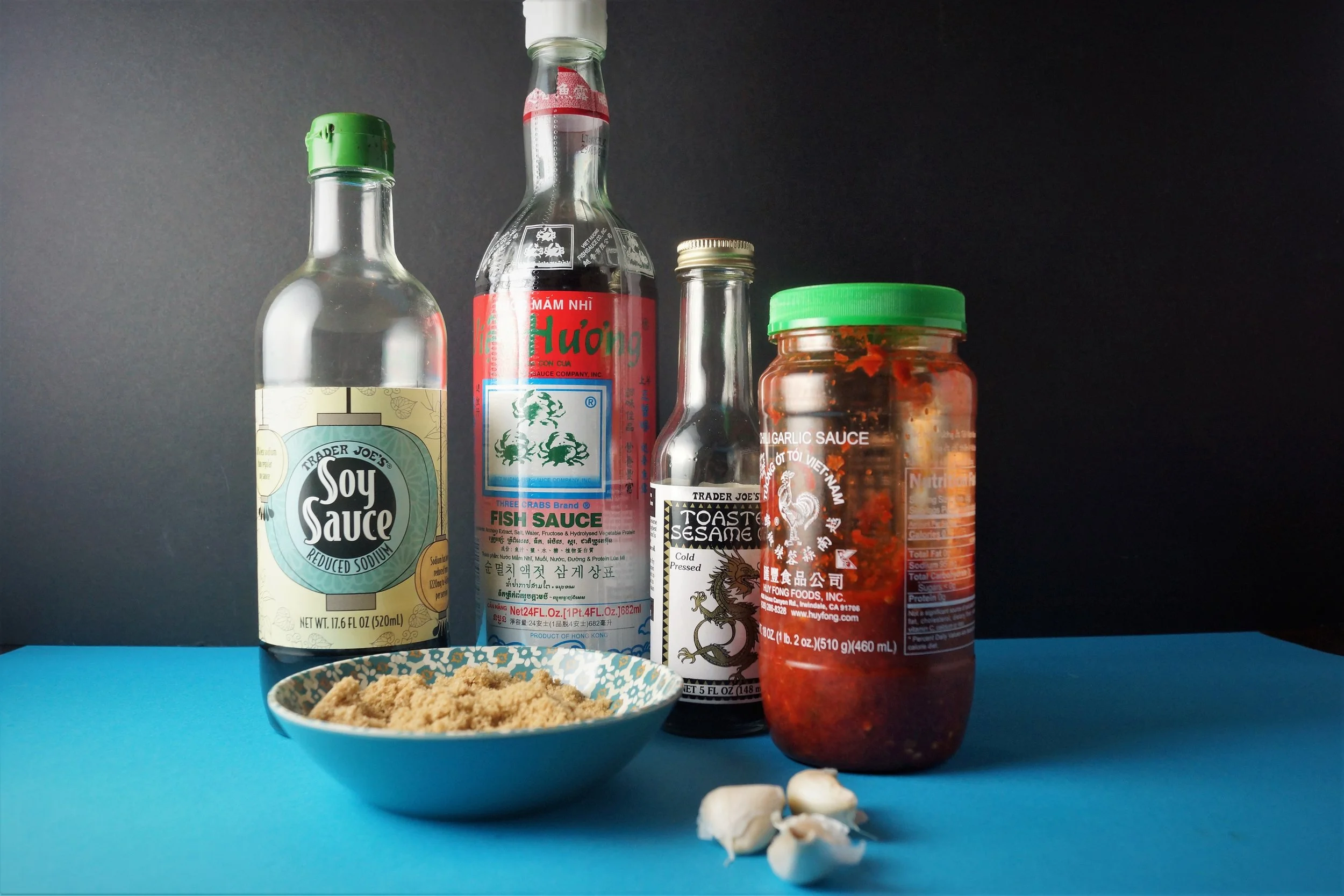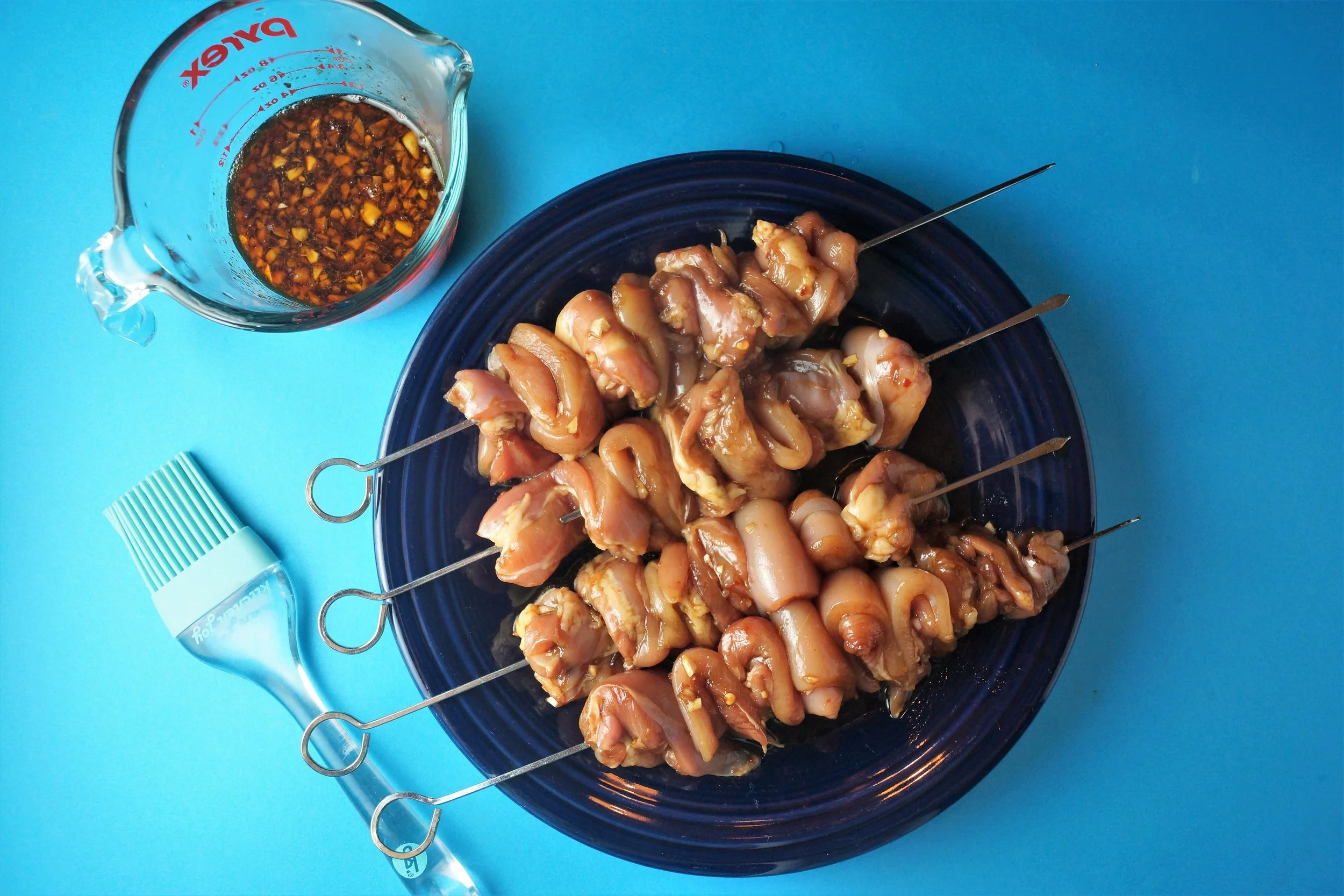 2. Stir together brown sugar, soy sauce, sesame oil, fish sauce, chile garlic paste, and garlic in a large bowl. Add chicken and toss to coat. Remove chicken from marinade and thread onto skewers ( I ended up using 4 skewers total).
