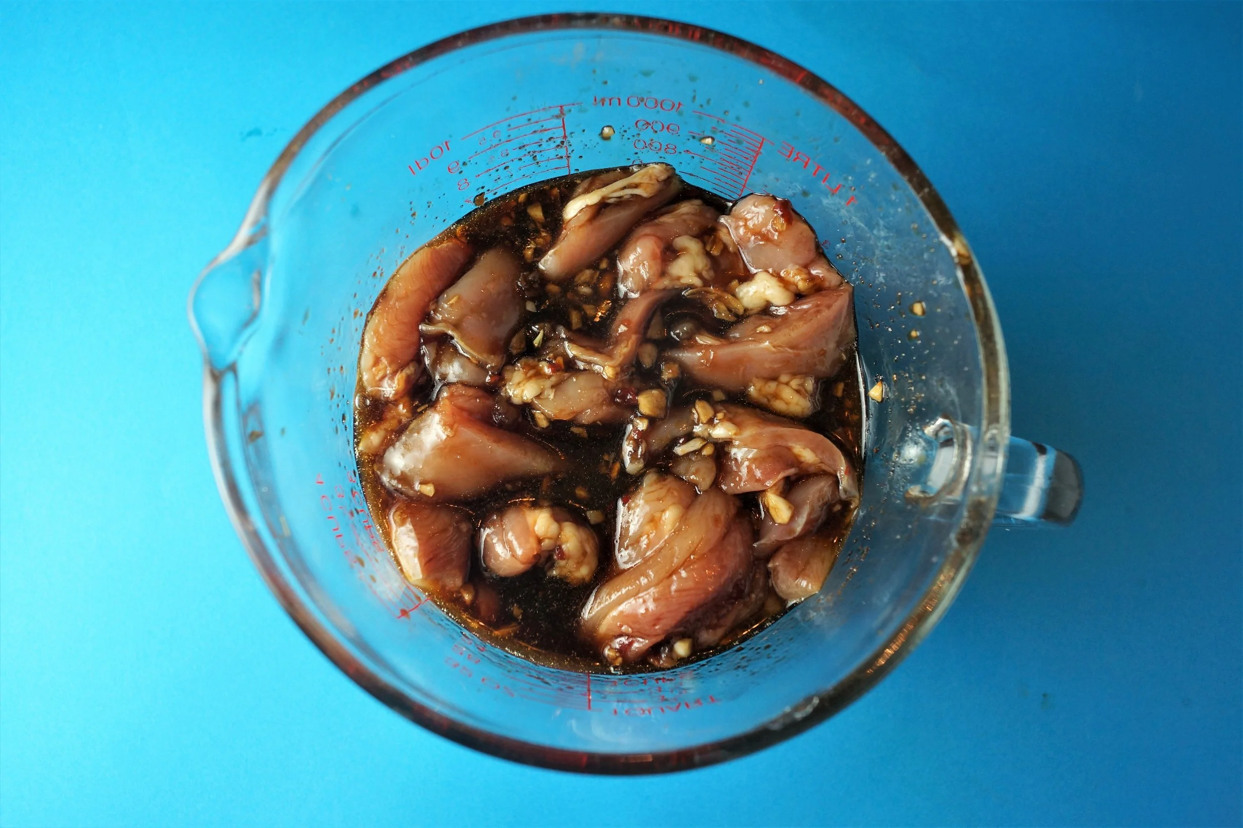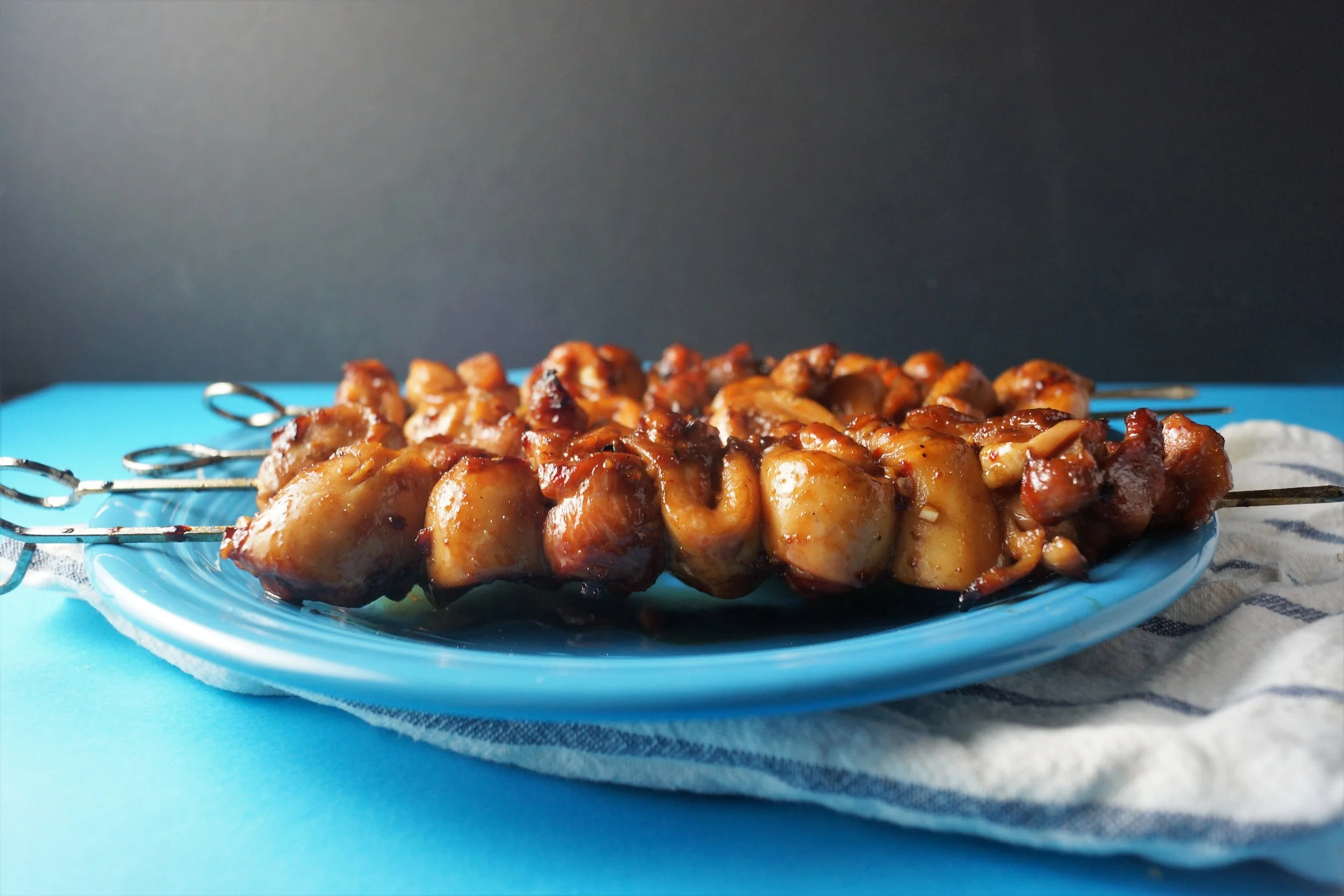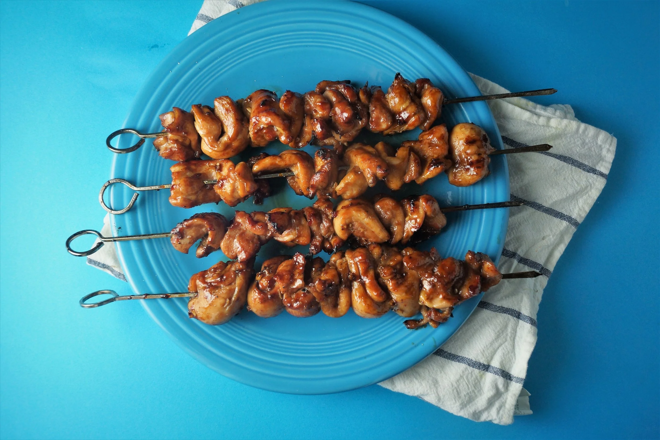 The trick here is to use chicken thighs. Sliced into strips, quickly soaked in a sweet soy marinade, you thread them onto skewers, resulting in lots and lots of surface area, and maximum crispy edges. The other key here is to cook the remaining marinade down to a glaze, and brush it over the skewers while grilling, so that you end up with perfectly sticky glazed pieces of chicken.