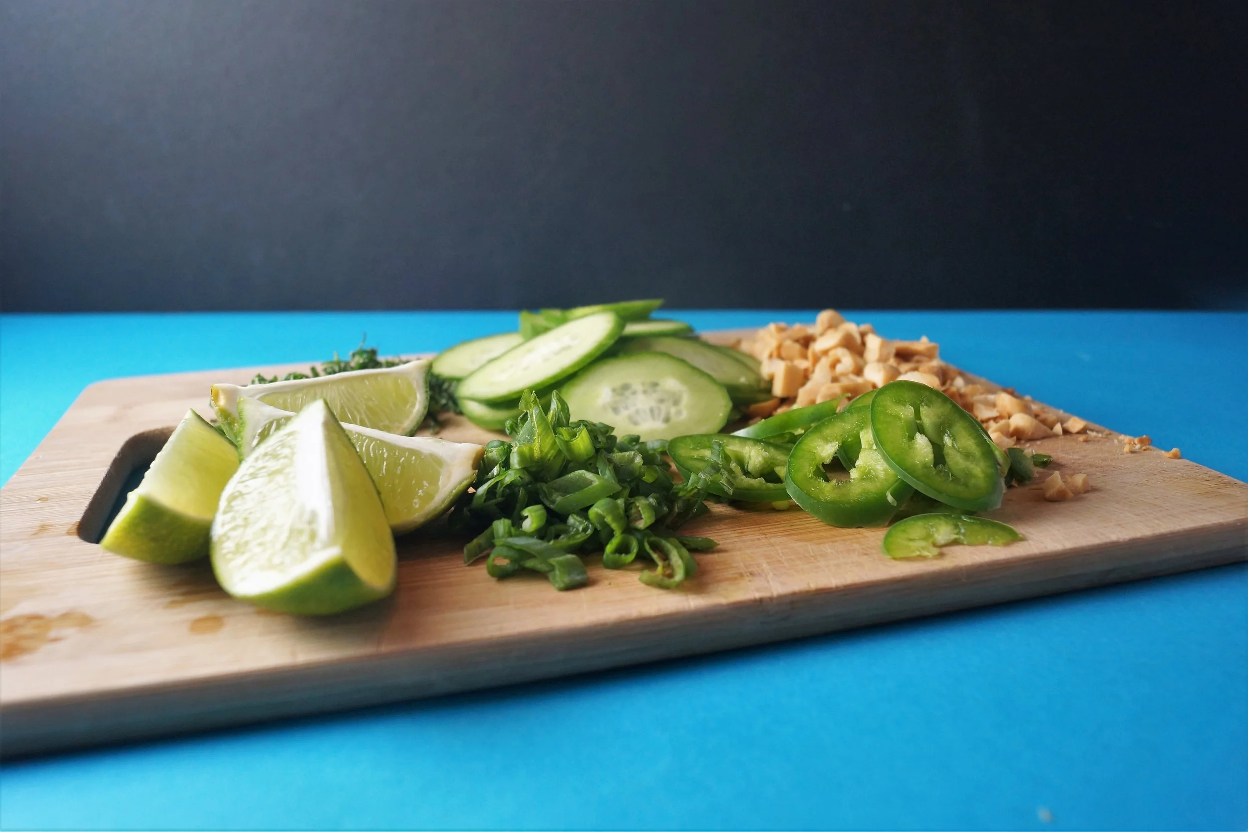 - Crispy rice*, sliced cucumber, mint, sliced scallion, chiles, chopped peanuts, and lime wedges for serving.
