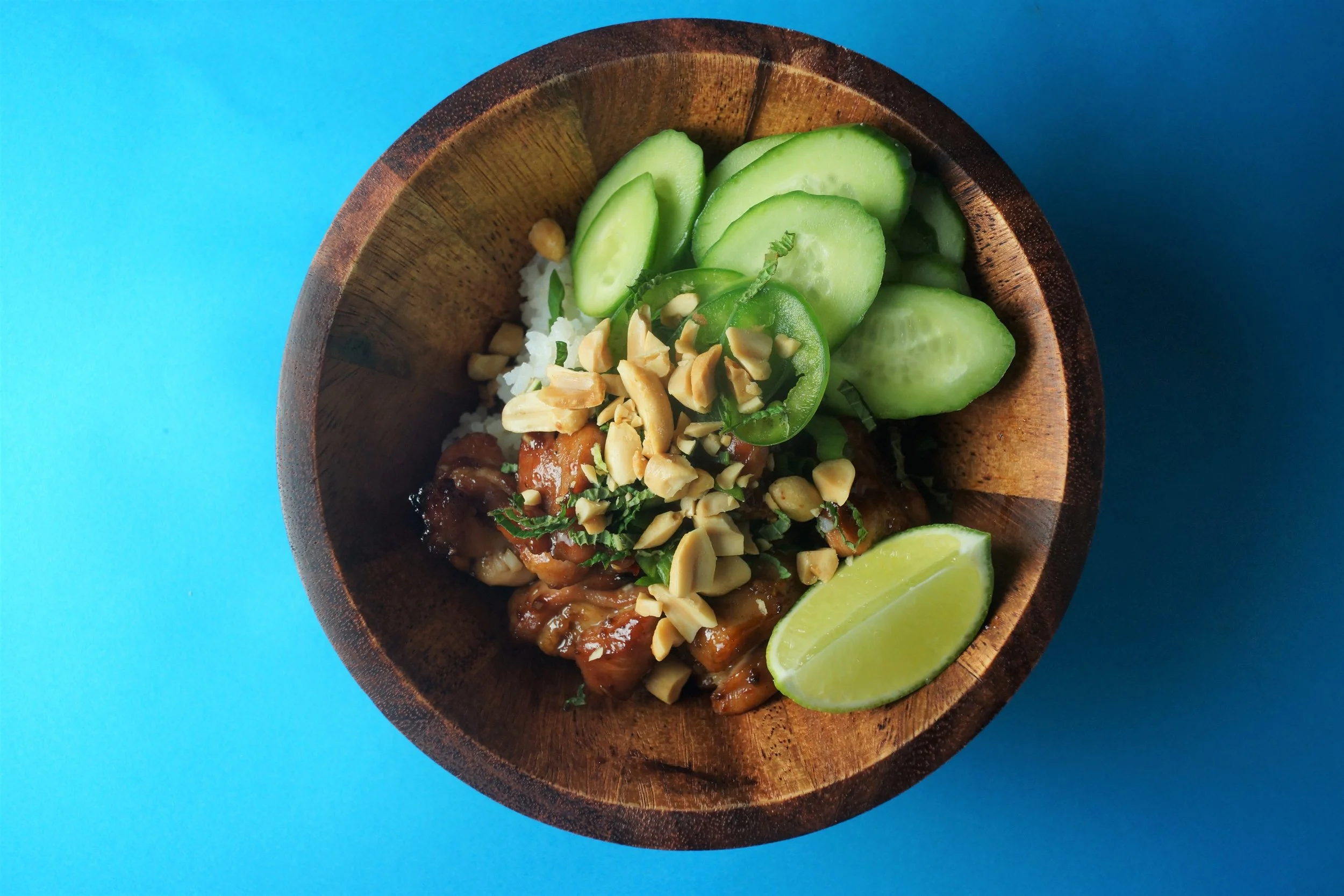 5. Remove chicken pieces from skewers and serve atop crispy rice with sliced cucumber, mint, sliced scallion, chiles, chopped peanuts, and lime wedges.